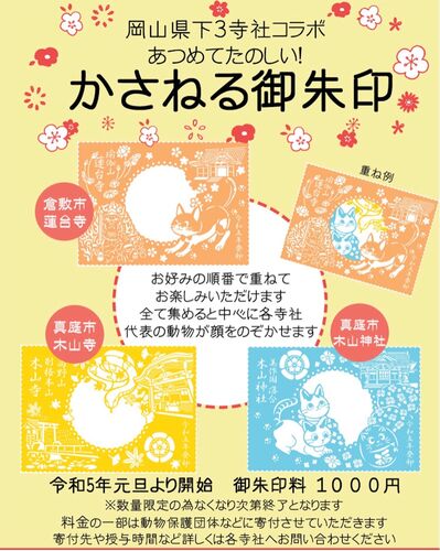 岡山県にある3寺社、由加山蓮台寺(倉敷市児島由加)、木山神社と木山寺(真庭市木山)は各寺社を巡って、「切り絵御朱印」3枚を重ねると一つの作品になる集めて楽しい企画を実施します! 蓮台寺は桃色、木山神社は水色、木山寺は黄色の紙を使い、重ねると…
