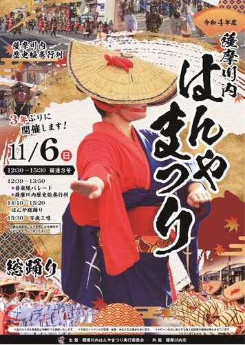 薩摩川内市の三大祭り「薩摩川内はんやまつり」が、3年振りに開催されます! 音楽隊パレード、薩摩川内歴史絵巻行列や、約2,000人が参加するはんや総踊りをぜひ、ご観覧ください。※今年のメイン会場は向田側です。 【日時】11月6日(日) 12:30〜15:30 詳細が…